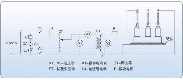 按YKA-GB工频放电试验接线原理图(如下图)将相关仪表和设备连接好,其中ZT为调压器,ST为5KVA以下试验变压器,V为高压表,µA为数字微安表。